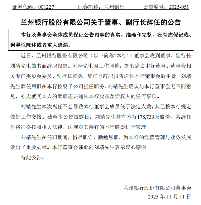 11月11日,兰州银行股份有限公司关于董事、副行长辞任的公告。刘靖先生因工作调整,提出辞去兰州银行董事、董事会相关专门委员会委员、副行长职务。